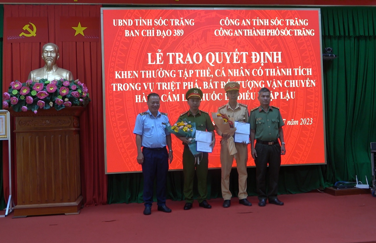 Chiều ngày 27/7/2023, Văn phòng Thường trực Ban Chỉ đạo 389 tỉnh Sóc Trăng phối hợp với Công an huyện Kế Sách và Công an Thành phố Sóc Trăng, tổ chức Lễ trao quyết định khen thưởng tiền đột xuất cho các tập thể, cá nhân có thành tích trong vụ triệt phá, bắt đối tượng vận chuyển hàng cấm là thuốc lá điếu nhập lậu