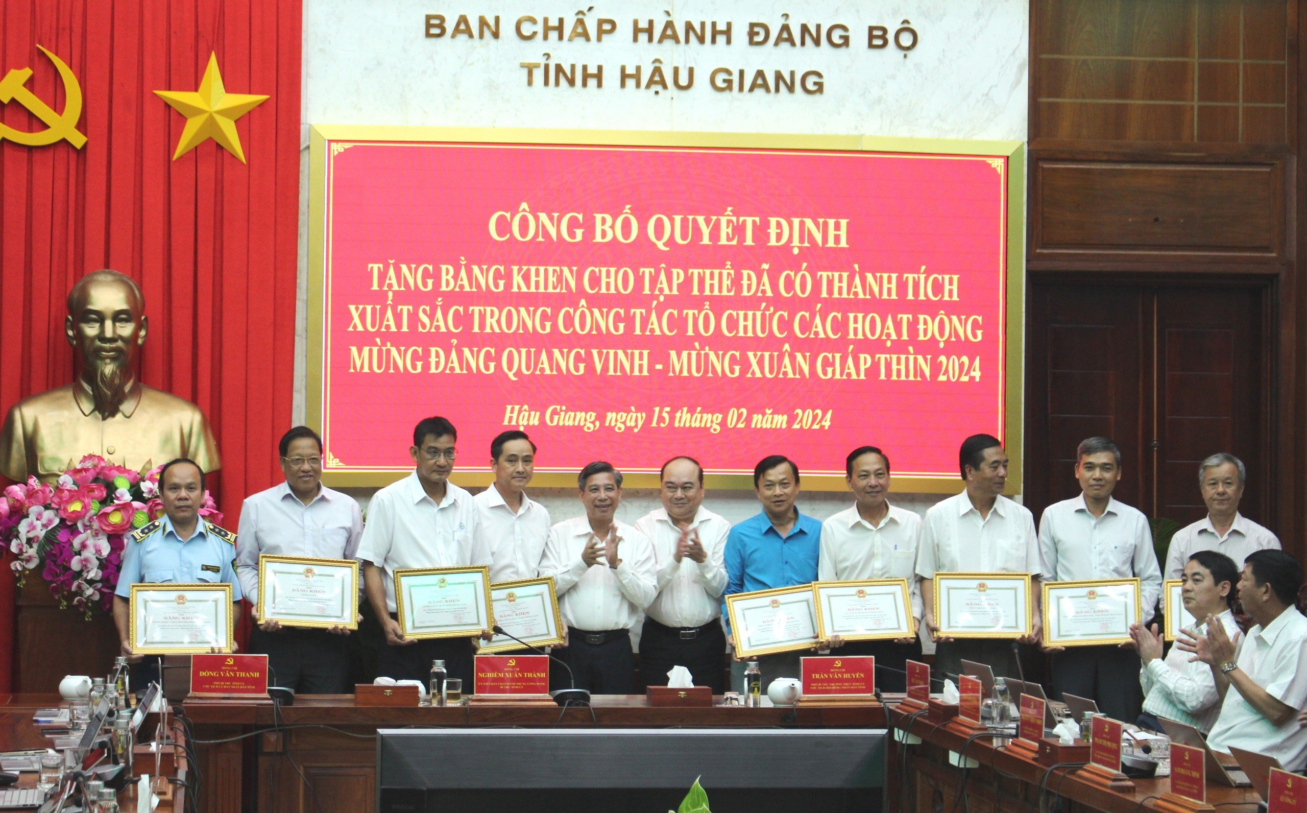 Cục Quản lý thị trường tỉnh Hậu Giang được Chủ tịch UBND tỉnh trao tặng bằng khen có thành tích xuất sắc trong công tác tổ chức các hoạt động “Mừng Đảng quang vinh – Mừng Xuân Giáp Thìn 2024” trong buổi họp giao ban đầu năm 2024 của Tỉnh ủy Hậu Giang vào ngày 15/02/2024.