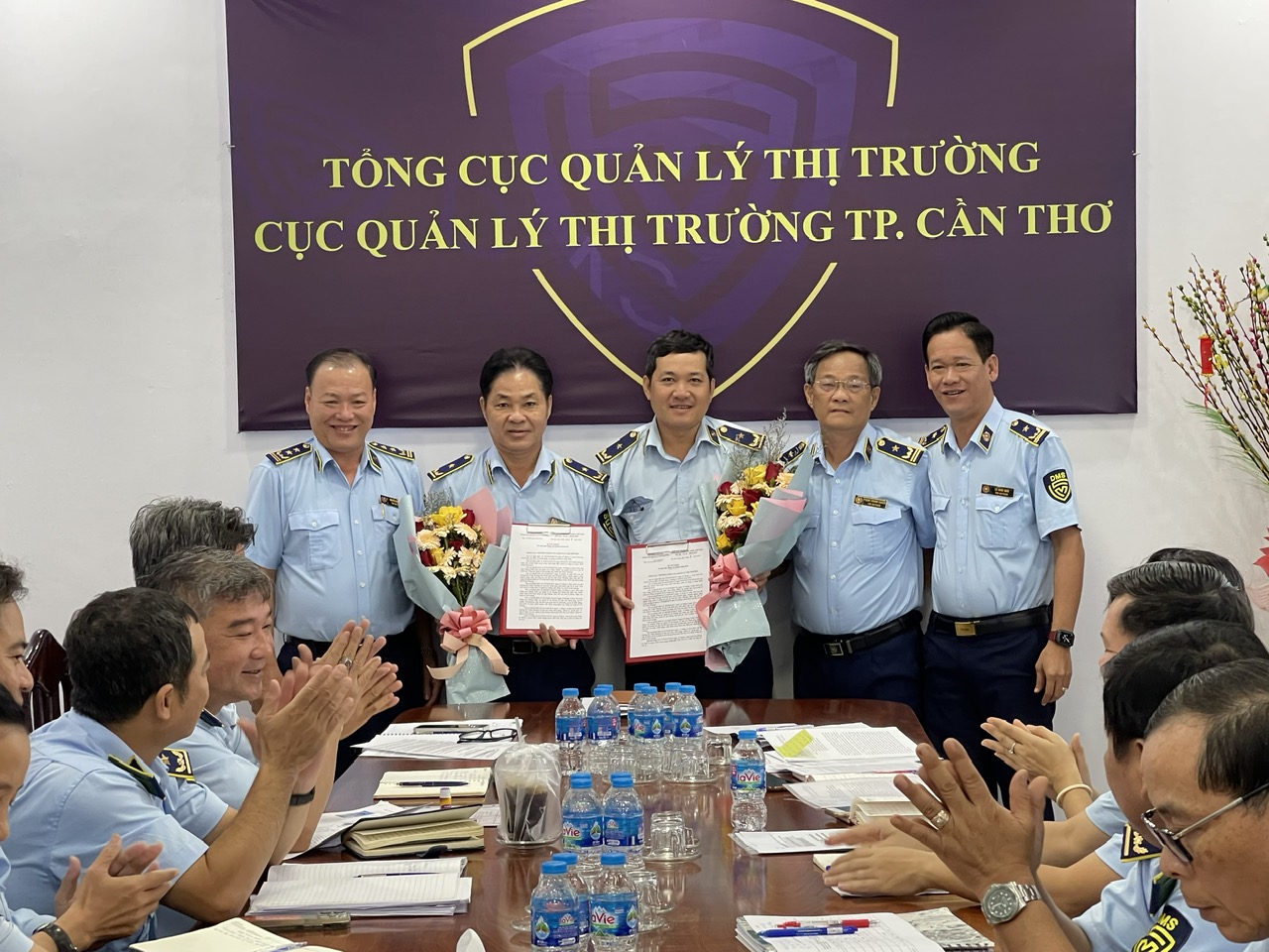 Ông Nguyễn Hùng Em, Bí thư Đảng ủy, Cục trưởng Cục Quản lý thị trường thành phố Cần Thơ đã trao Quyết định điều động, bổ nhiệm và trao hoa chúc mừng ông Đỗ Thanh Tùng, Phó Đội trưởng Đội Quản lý thị trường số 1 và ông Đặng Văn Tuấn, Phó Đội trưởng Đội Quản lý thị trường số 5.